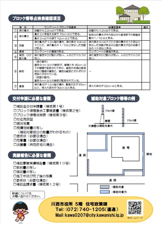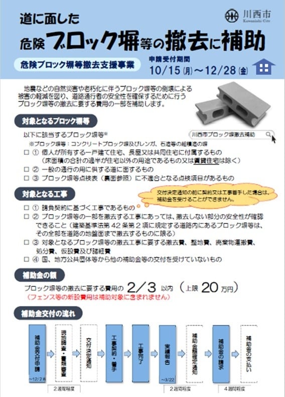 トップページ > お知らせ新着情報とお知らせ 一覧へ戻る川西市の危険ブロック撤去補助事業は受付が12/28で終了します2018-12-19川西市の危険ブロック撤去工事補助事業の受付が12/28で終了します。工事をご検討の方は何でもご相談ください。 宝塚市、伊丹市、西宮市、池田市等も補助事業があるので、一度ご覧になってください。 川西市HP: http://www.city.kawanishi.hyogo.jp/kurashi/kurashi/sumai/1007319.html 宝塚市HP: http://www.city.takarazuka.hyogo.jp/s/anzen/1009509/kaihatsu/1026609.html 伊丹市HP: http://www.city.itami.lg.jp/oshirase/1540789454617.html 西宮市HP: https://www.nishi.or.jp/kurashi/anshin/bosaijoho/shinotaisaku/taishinka/burokkubeitekkyohojo.html 池田市HP: http://www.city.ikeda.osaka.jp/kurashi/guide/bosai/1531272038984.html