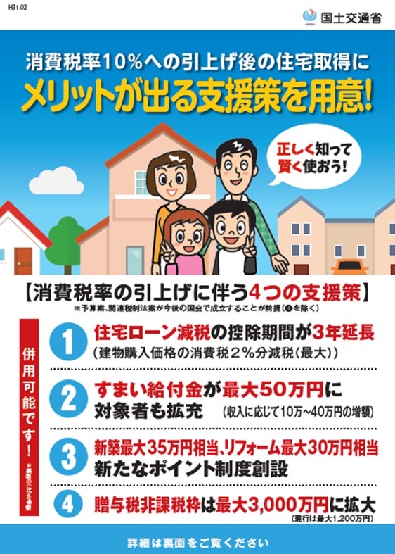 トップページ > お知らせ新着情報とお知らせ 一覧へ戻る消費税率引上げに伴う住宅取得に係る対応について2019-03-09先日国交省から消費税率引上げに伴う住宅取得に係る対応についての説明会がありました。住宅ローン減税や次世代住宅ポイント制度等、お得な情報が多く載っています。詳しいことがお聞きになりたい方は弊社までご連絡ください。http://www.mlit.go.jp/jutakukentiku/house/jutakukentiku_house_fr4_000036.html